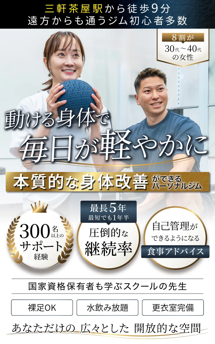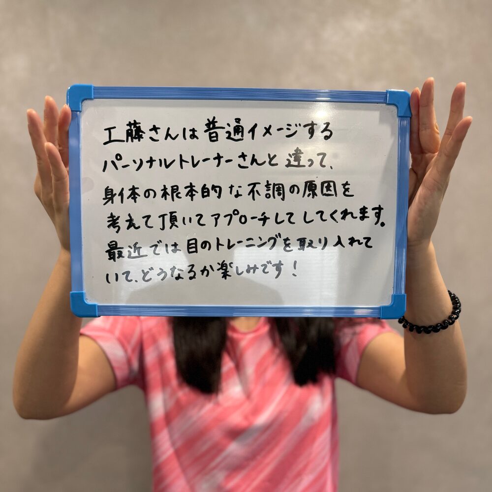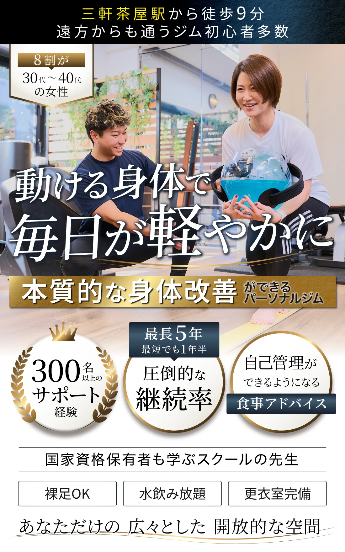 に投稿されました AITrustindex は、レビューの元のソースが Google であることを確認します。 三軒茶屋で姿勢を整えたくて、工藤さんにパーソナルトレーニングをお願いしました。 猫背や巻き肩が気になっていましたが、毎回わかりやすくサポートしてもらえて、少しずつ体の使い方に意識が向くようになりました。 自分では気づかなかったクセや改善のポイントを丁寧に教えてもらえたのが印象に残っています。 工藤さんは知識も豊富で、他にもボディメイクや生活習慣など幅広く相談でき、楽しく通わせてもらっています♪に投稿されました yuuTrustindex は、レビューの元のソースが Google であることを確認します。 通い始めて5年以上になります。体の仕組みから使い方まで分かりやすく教えてくださるので、非常に効率がいいトレーニングができていると思います。何より見た目が目に見えて変わりました。元々肩こりもひどく頻繁に頭痛が起きていましたが、今は昔よりかなり改善されています。トレーニング初心者でジムに行こうと考えてる方は、まずは正しい姿勢、フォーム、食事の取り方を身につけるにはとても参考になると思います。に投稿されました A NTrustindex は、レビューの元のソースが Google であることを確認します。 ハッキリキッパリ指導してくれるので、こちらも質問がしやすく、また今後は自分一人でもやっていけるように習慣づけることの大切さを教えてくれます! トレーニングのあとは体が整う感覚がしてわたしは好きでした。に投稿されました akiko kadoyaTrustindex は、レビューの元のソースが Google であることを確認します。 このジムのトレーナーさん、若いですが経験豊富で、チャラチャラしてません笑 パーソナルでは自分でも気づかなかったクセとか課題をサクッと見抜いてくれて、分かりやすく説明して修正や対策を講じて頂けるので、なるほどと納得しながら、しっかりと動きの感覚も良くなります。自分でトレーニングする時にも活きてきますし、何かと効率良いです。迷ってるなら一回行ってみてもいいかも。おすすめです!に投稿されました 矢吹奈菜Trustindex は、レビューの元のソースが Google であることを確認します。 デスクワーク中心で肩こりやストレートネックが酷く、こちらで相談したところ、今の体の状態を細かく確認していただき、原因となっていた骨盤に対するアプローチを教えていただくことができました。マッサージ等で痛みを一時的に少なくできても、原因を改善できないままでは結局辛いので、継続して通い原因をなくしていきたいと思います。なぜ今そのストレッチやトレーニングをすべきなのかを細かく説明してくださるのでとても信頼できます。に投稿されました 高Trustindex は、レビューの元のソースが Google であることを確認します。 いつもありがとうございます。当初はダイエットで通い始めましたが、目標達成したため現在はヒザ痛などの足の機能改善を取り入れた運動をしていただいています。この運動を通じて姿勢が良くなり歩き方が改善されているようでバランスが取れてつまずくことがかなり減りました。ヒザの痛みもかなり減りました。 場所も三軒茶屋と通いやすくジムを続けられている理由の1つです。 今後ともよろしくお願い致します。に投稿されました Rikako HaraTrustindex は、レビューの元のソースが Google であることを確認します。 三軒茶屋駅から徒歩10分くらいです。筋トレだけでなく巻き肩や姿勢改善のメニューも取り入れてくださり、自宅でできるストレッチなども教えてもらっています。毎回とても丁寧にフォームを指導してくれるので、ジムで1人でトレーニングする際の参考にもなってます!