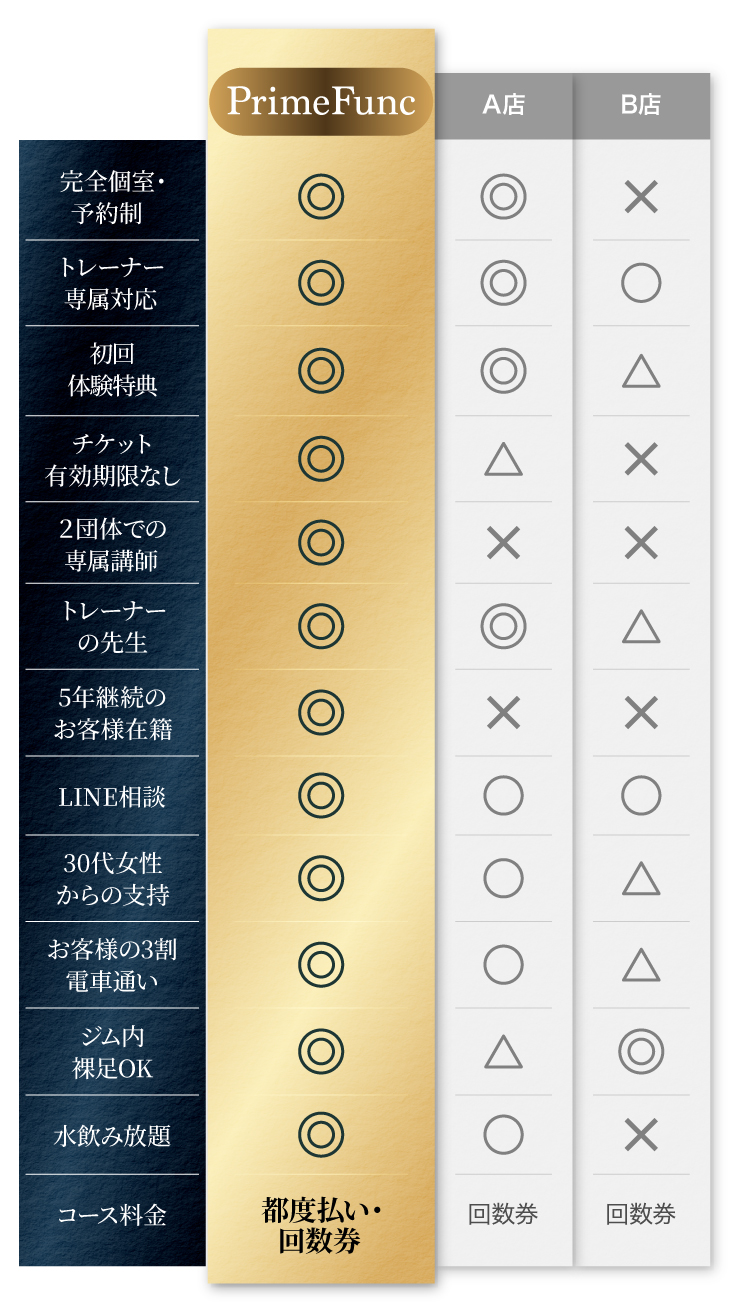 「自分史上、最高に機能的で美しいカラダづくり」を叶える本質的な身体改善サポートをご提供します。これまで200人以上の方をサポートしてきた経験を活かし、お客様の悩みに寄り添ったカスタマイズプログラムでサポートします。また、PrimeFuncではお客様自身が主体的に取り組んでいただくことを大切にしています。自分自身で考え取り組むことで、たとえPrimeFuncを卒業しても自らの意志で理想の未来を実現することができるからです。ただ「痩せる」「鍛える」だけじゃなく「一生モノの身体づくり」を一緒に目指しましょう。強引な指導や押しつけは一切ありません。その日の体調やお気持ちを大切にしながら、長く付き合える身体づくりを、あなたと一緒に進めていけたらと思っています。