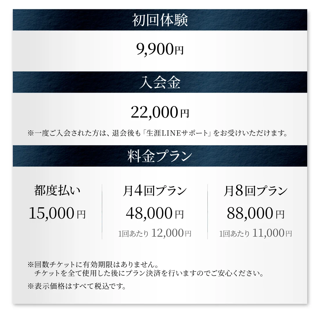 パーソナルトレーニングジムACTIVEは、月会費制と都度払い制を取り入れております。これは、お客様に楽しく続けていただき理想の身体を手に入れて欲しいという想いからです。また、紹介割引も設けておりますので、ぜひご活用いただければと思います。ご不明な点がありましたら、公式LINEや来店の際にお問い合わせください。